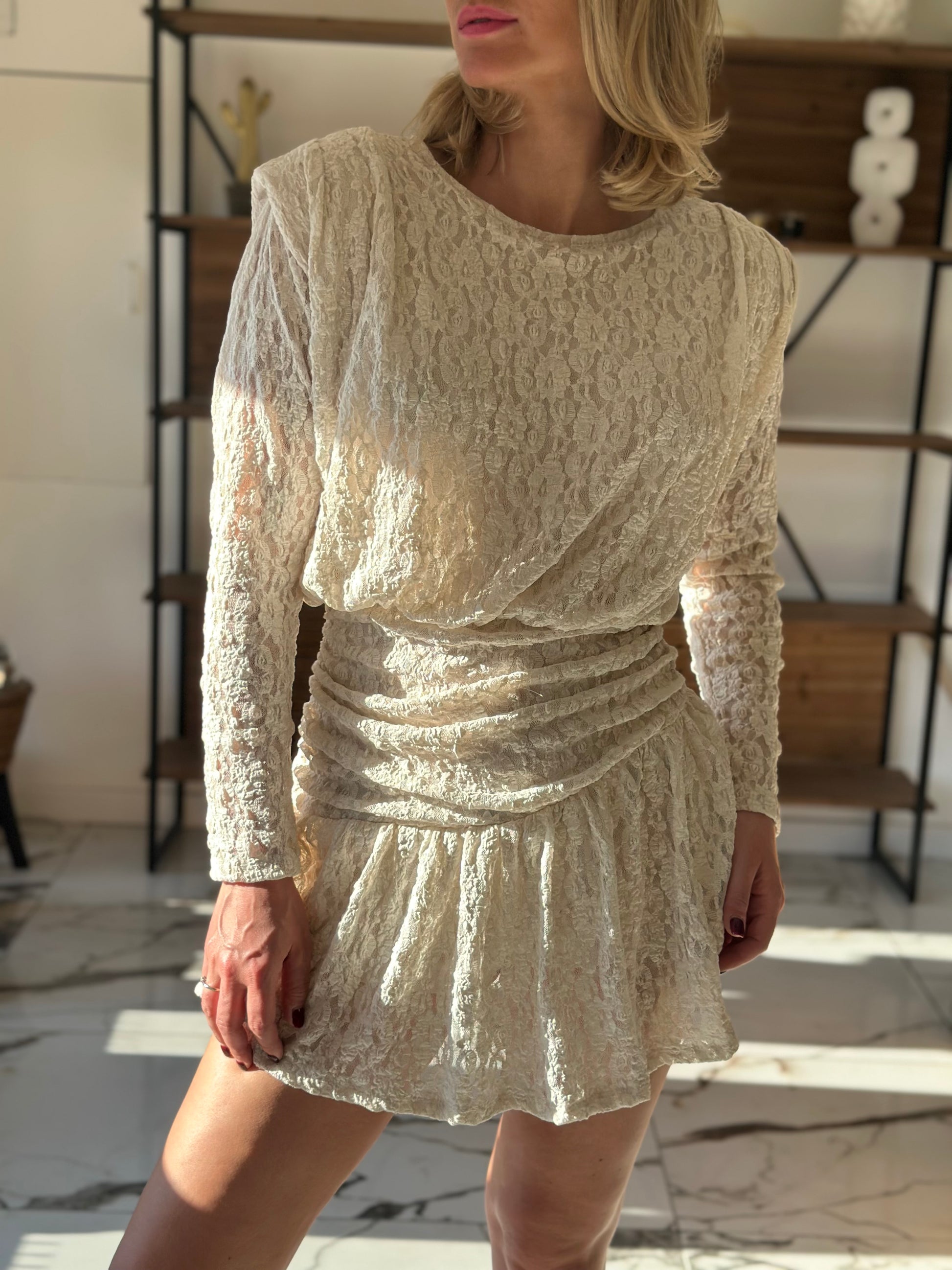 La robe Mina présente un design bohème élégant, intégrant de la dentelle beige. Ce modèle court est conçu pour offrir une allure raffinée tout en garantissant un confort optimal. Sa composition soigneusement sélectionnée permet une respirabilité accrue, idéales pour des occasions variées et des temps de port prolongés.
